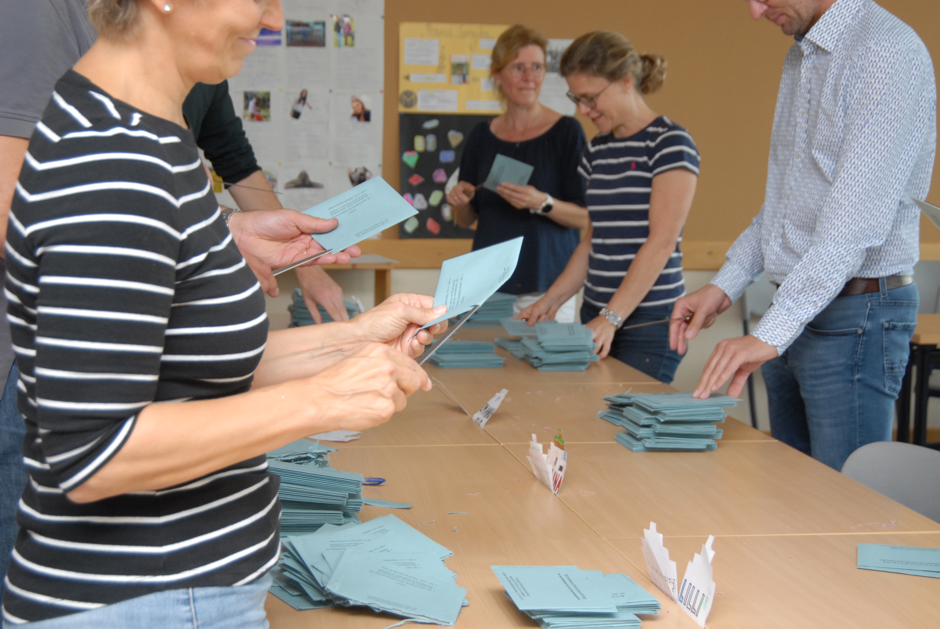 Für die Briefwahl kommen die Wahlhelfenden ab 14:30 Uhr an einem zentralen Ort zusammen. Dort bereiten sie die Auszählung vor: Umschläge werden sortiert und gezählt, die Gültigkeit der eingegangenen Wahlbriefe wird geprüft und über die Zulassung zweifelhafter Wahlbriefe beschlossen. So gehen nur gültige Wahlbriefe in die Stimmauszählung ab 18 Uhr. Anschließend fließt auch das Briefwahlergebnis in das Gesamtergebnis für den Wahlkreis ein.