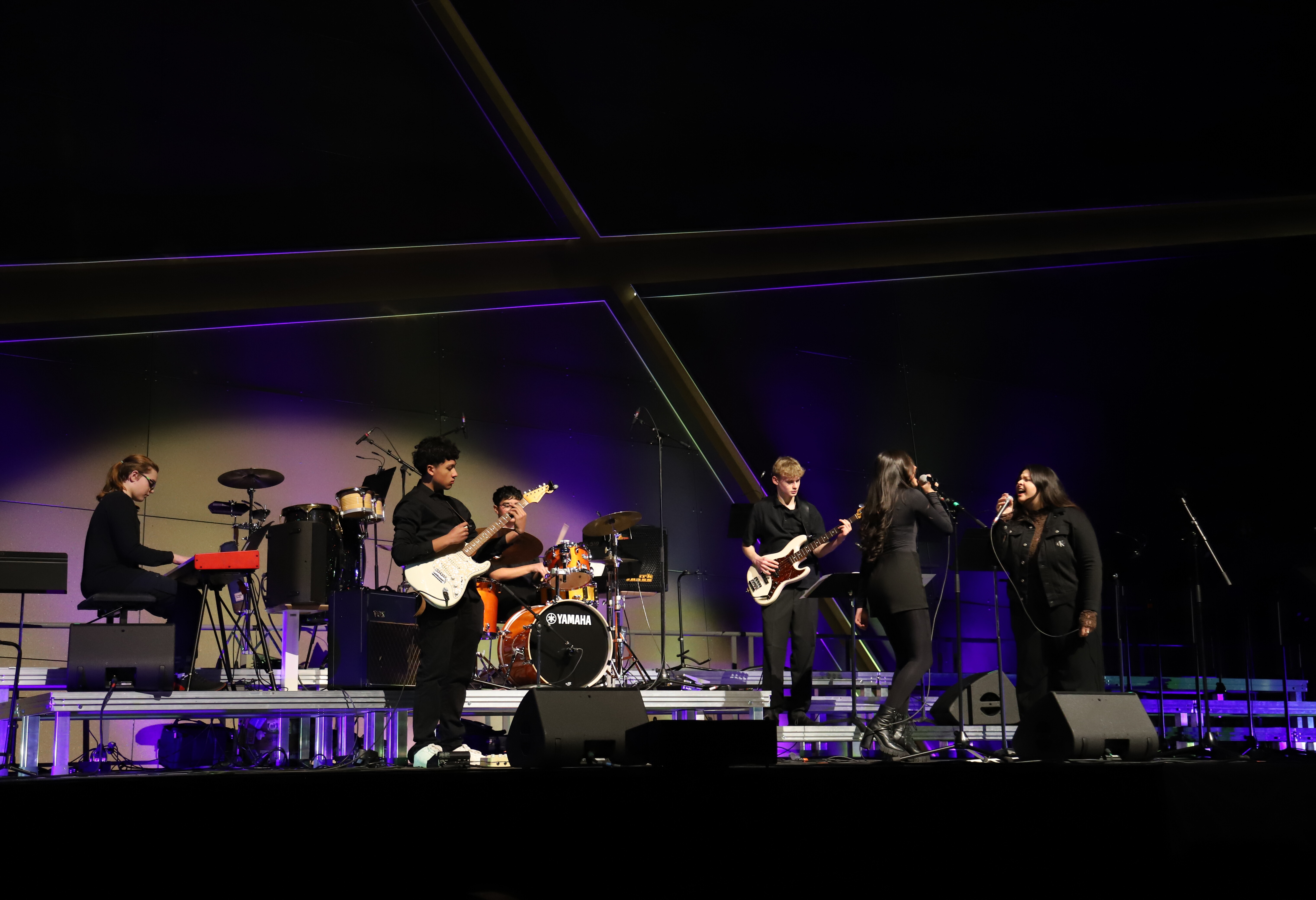 Die Schulband der Oberschule Adendorf ist schon zum zweiten Mal bei Musikuss dabei. Für den Lehrer und Band-Leader Michael Manske ist jedes Konzert eine sehr willkommene Herausforderung, um mit seinen sechs Schülern und Schülerinnen aus den Jahrgängen 8 und 9 ein neues Repertoire zu erarbeiten. In dieser Besetzung ist die Band seit rund zwei Jahren sowohl auf Schul- als auch auf außerschulischen Veranstaltungen vertreten. Die Stücke werden von den Schülerinnen und Schülern selbst ausgewählt und mit Hilfe von Video-Tutorials und Unterstützung der Lehrkraft einstudiert. Meist handelt es sich um Soulmusik gewürzt mit Latino-Jazz-Elementen.