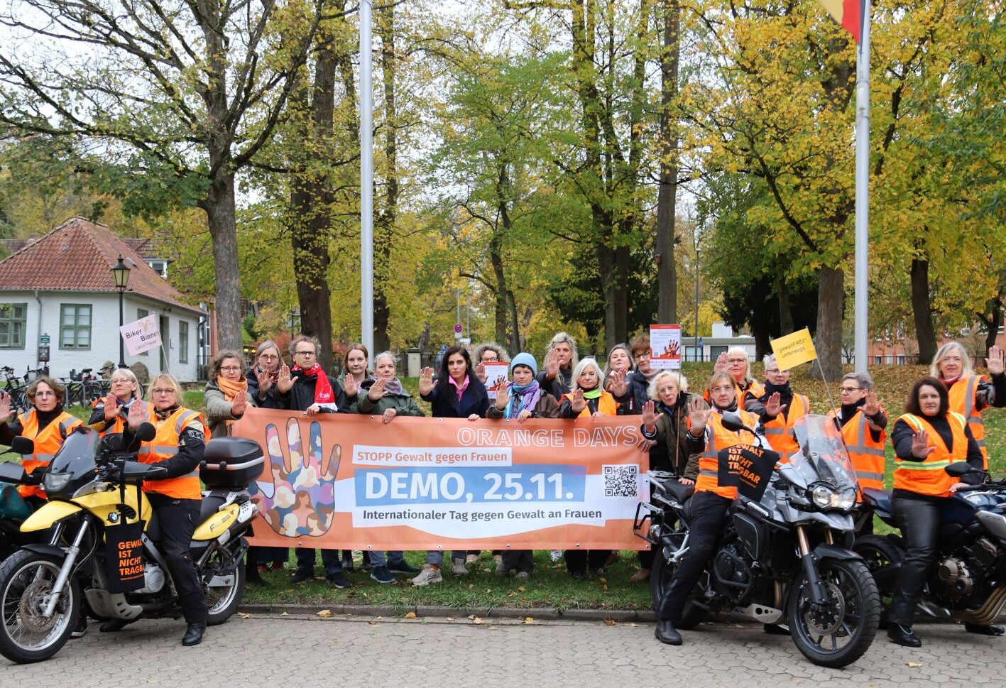 Darüber hinaus setzen die Stadt, die Polizei und die Leuphana Universität ein deutli- ches Zeichen mit den Fahnen „Nein zu Gewalt an Frauen“. Der Landkreis und das Museum Lüneburg beteiligen sich zudem für den gesamten Zeitraum an den Orange Days, indem die Fahnen vom 25.11. bis 10.12.23 gehisst werden. Die Demo wird auch von einer Sprühkreideaktion in der Innenstadt mit der Aufschrift „Gewalt hinterlässt Spuren“ durch die Frauenpolitische Initiative begleitet. Die Mitglieder des Runden Tisches gegen Gewalt in der Familie verteilen: