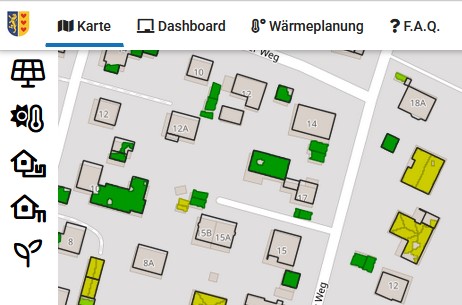 Das Gründachkataster des Landkreises Lüneburg zeigt durch Einfärbung der Dachflächen an, wie gut sich ein Gebäude für eine Dachbegrünung eignet. Darüber hinaus können über eine Detailanalyse auch die eingesparte Abwassermenge, die CO2-Absorption und der gehaltene Feinstaub pro Jahr geschätzt werden.