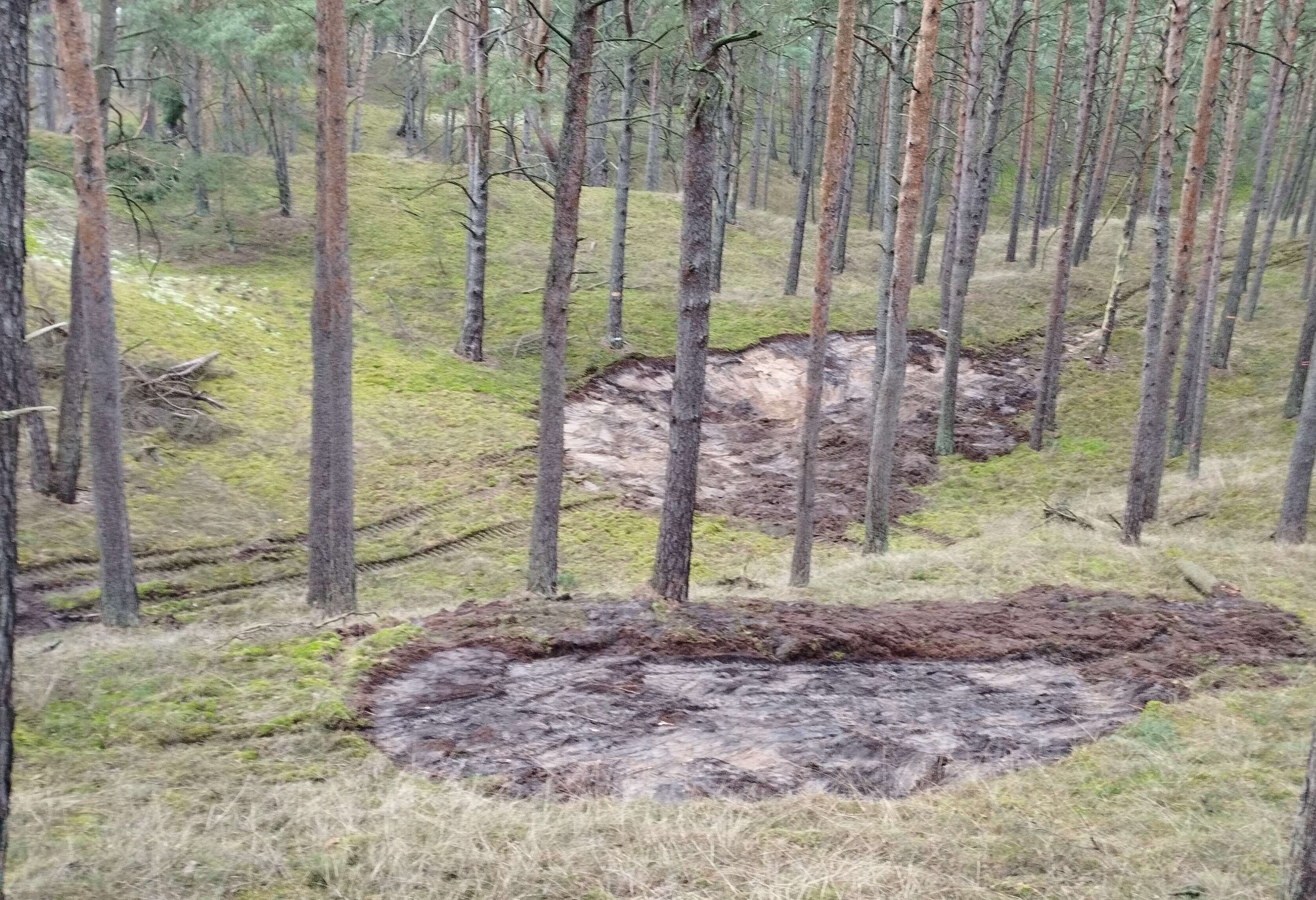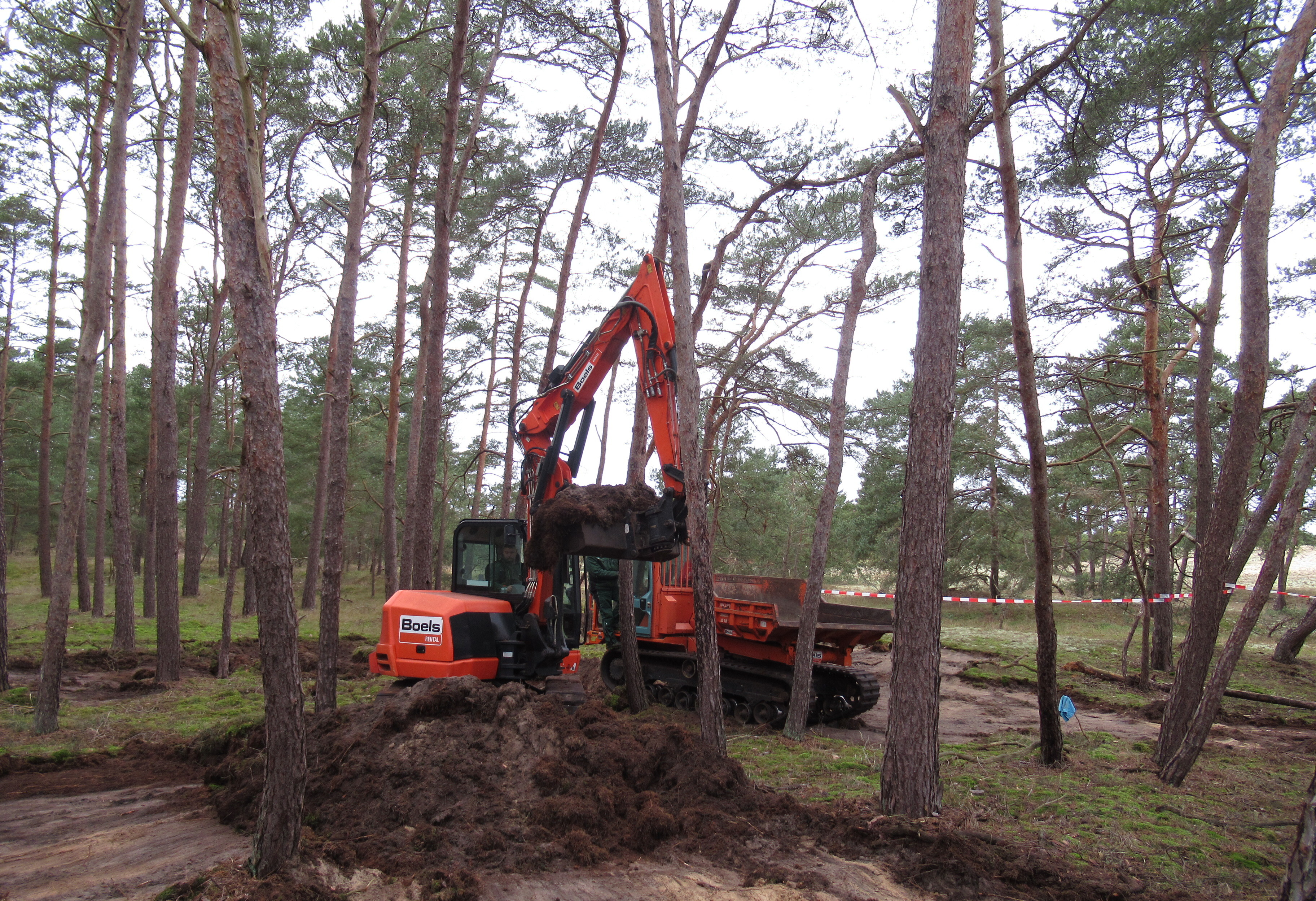 Vor Beginn der Maßnahmen-Ausschreibung und -Umsetzung musste noch der Verbleib des Abtragsmaterials geklärt werden. Hierzu wurde eruiert, ob das Material in der Erdenindustrie Verwendung finden könnte. Die Beprobung durch einen Erdenhersteller aus dem Brandenburgischen ergab jedoch, dass der zeitliche und finanzielle Aufwand zur Vorbehandlung des Materials zu unwirtschaftlich sei. Auch eine anderweitige Abfuhr/Entsorgung des Materials z.B. in räumlich benachbarte Kompostierungsanlagen wäre sehr kostenintensiv; zudem würde der Abtransport aus dem Dünengelände vermeidbare Schäden im Wald und den offenen Dünen anrichten. So wurde sich, zwischen Auftraggeber, ausführenden Betrieb und den Flächeneigentümern, auf einen Verbleib des Materials in vorbeeinträchtigten Bereichen im Projektgebiet und nahe der Abtragsflächen geeinigt. Dies war insofern unschädlich, als dass das aus dem Wald stammende Material keinen Abfall darstellt.
