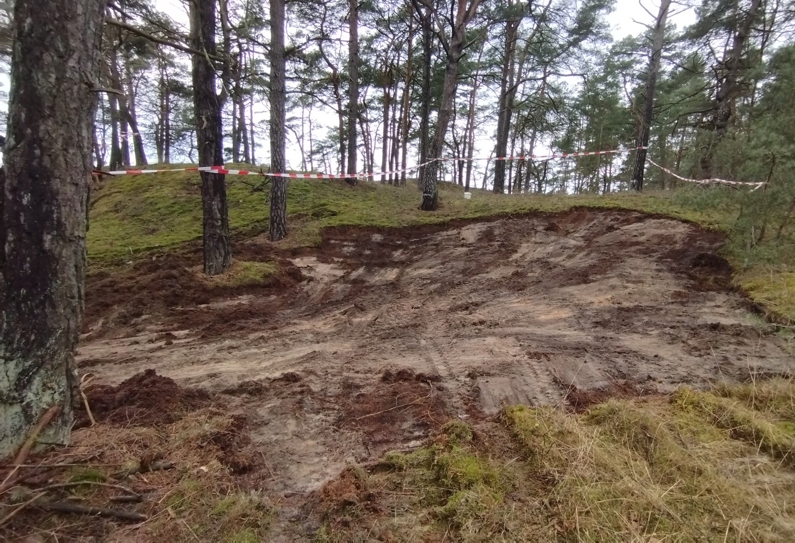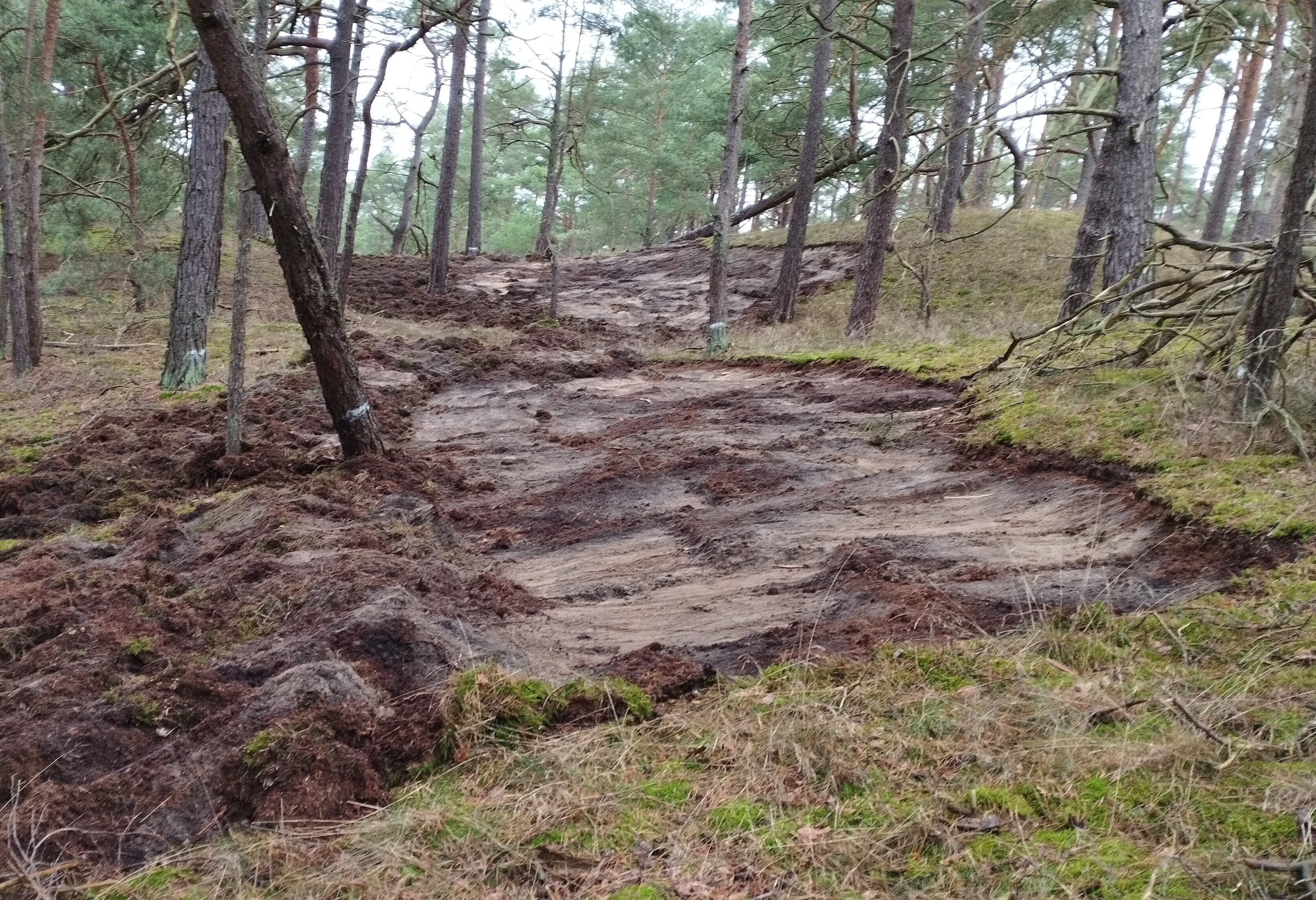 Im Januar 2023 erfolgte dann der eigentliche Abtrag des Waldmooses auf den vorausgewählten und gekennzeichneten Flächen. Die Arbeiten hat ein örtlicher Garten- und Landschaftsbaubetrieb ausgeführt. Die Abtragsarbeiten wurden mit einem mittelgroßen Kettenbagger durchgeführt; die Umfuhr des Abtragsmaterials im Dünengelände fand dann mit einem großen Kettendumper statt. Die Umsetzung erfolgte sowohl fachlich und zeitlich wie geplant. Die Bilder 11 bis 15 geben einen Eindruck von den Abtragsflächen wenige Tage nach Abschluss der Arbeiten Ende Januar 2023.