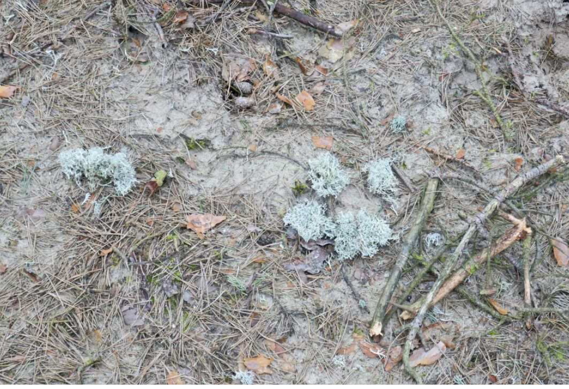 Die im Januar 2023 entstandenen Waldmoos-Abtragsflächen wurden erstmalig im September 2023 mit Flechtenthalli oder Flechten-Podetien beimpft, also auf die Flächen aufgebracht. Hierzu wurden aus angrenzenden größeren Flechten-Quellpopulationen in den Kaarßener Dünen von 22 verschiedenen Flechten-Arten entsprechende Flechten-Teile gewonnen und auf den konsolidierten Abtragsflächen verteilt. Eine zweite Beimpfung fand am 09.03.2024 statt. Dabei wurde bei beiden Beimpfungs-Aktionen darauf geachtet, dass die Quellpopulationen keine Beeinträchtigungen erfahren. Auch wurde darauf geachtet, dass die Ausbringungsorte den standörtlichen Ansprüchen der Flechtenarten gerecht werden.