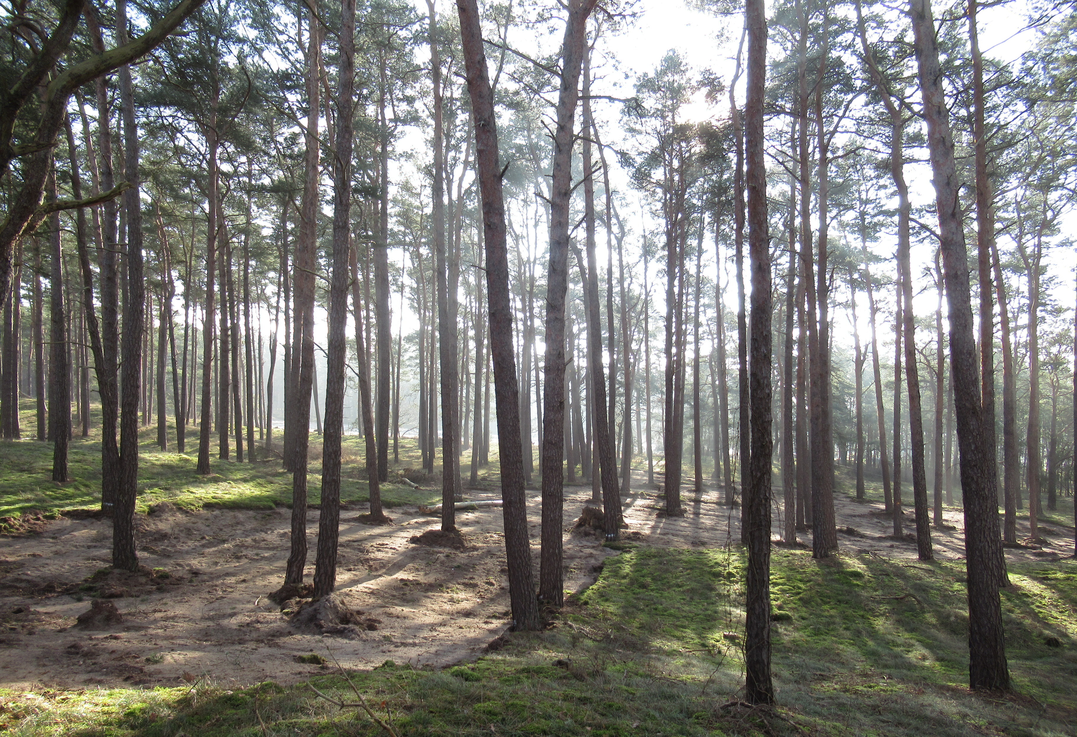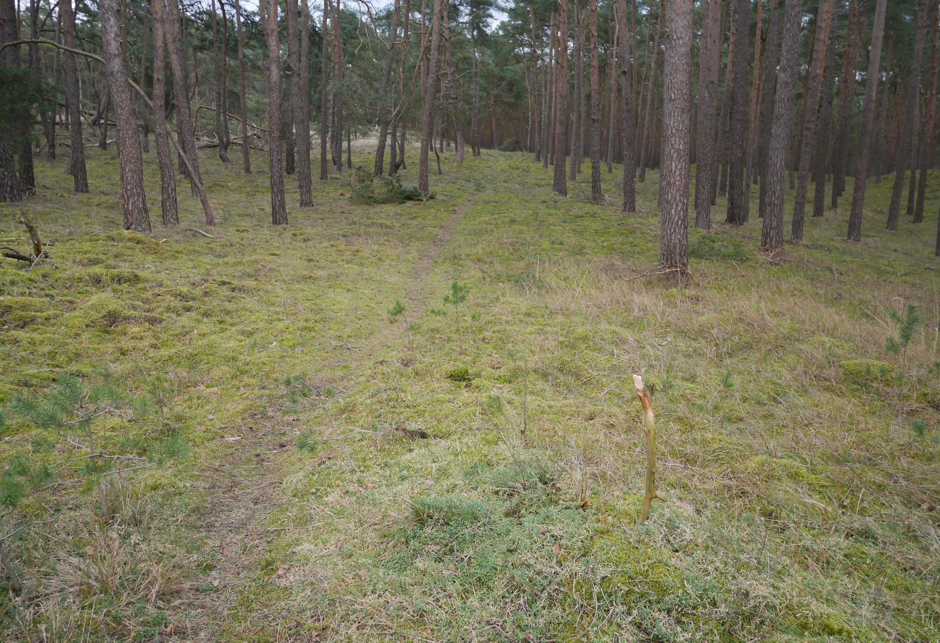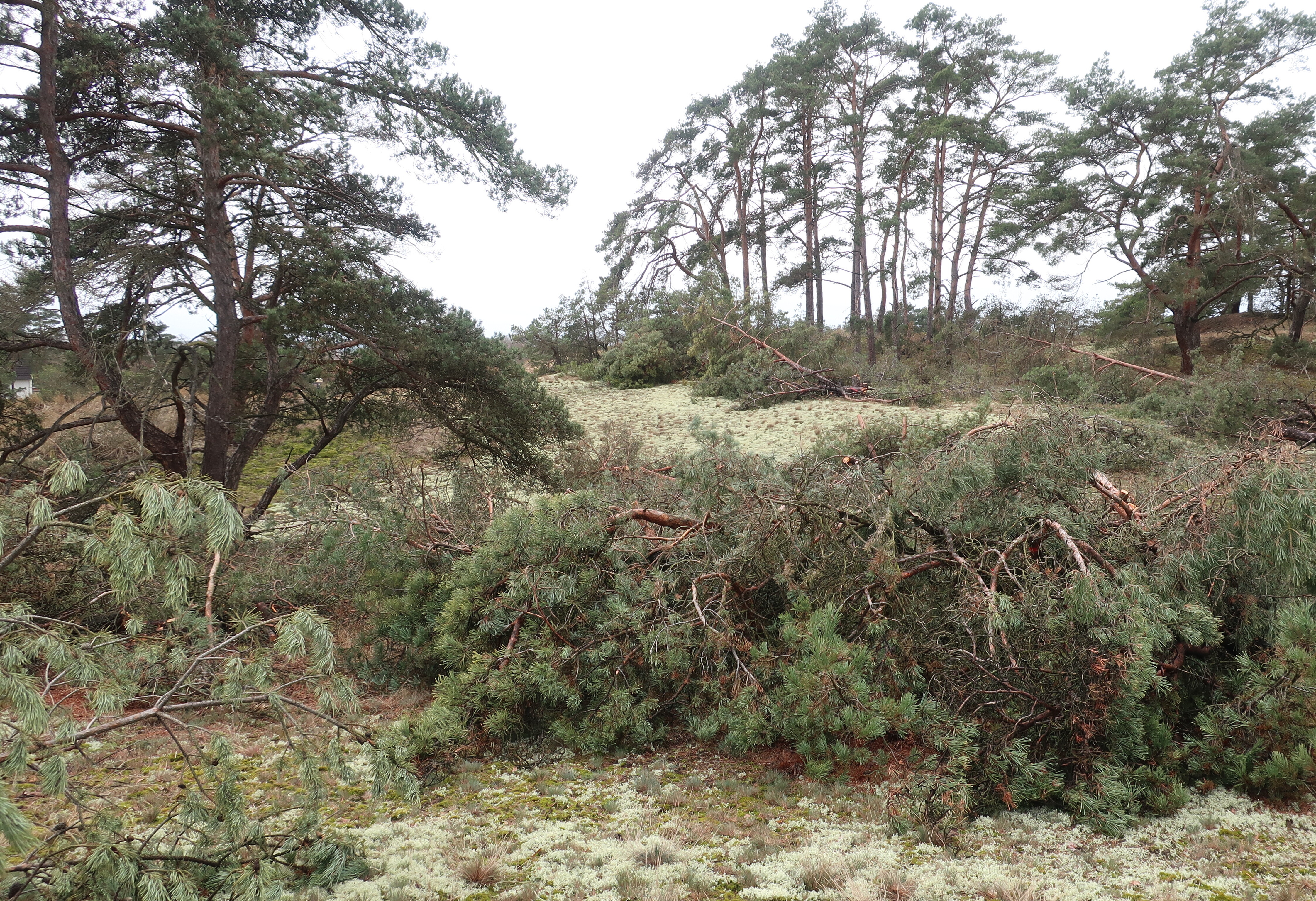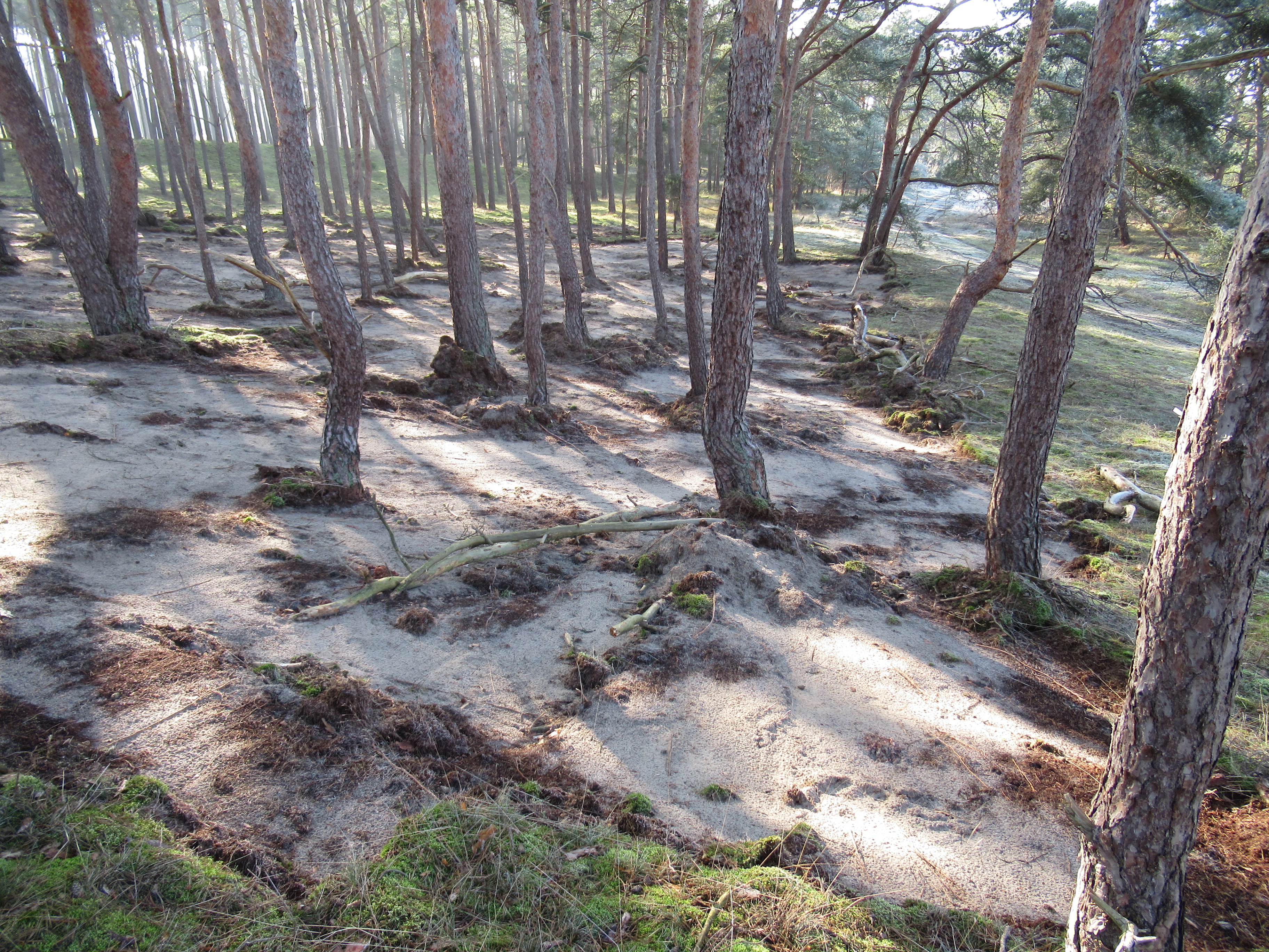 - Gegebenenfalls kleinräumige Entnahme von einzelnen Kiefern zur Schaffung eines Verbunds zwischen eingestreuten Offenlandflächen/Flechtenbeständen und/oder zur Erweiterung der offenen Düne und Verbesserung der dortigen Wind- und Dünendynamik
