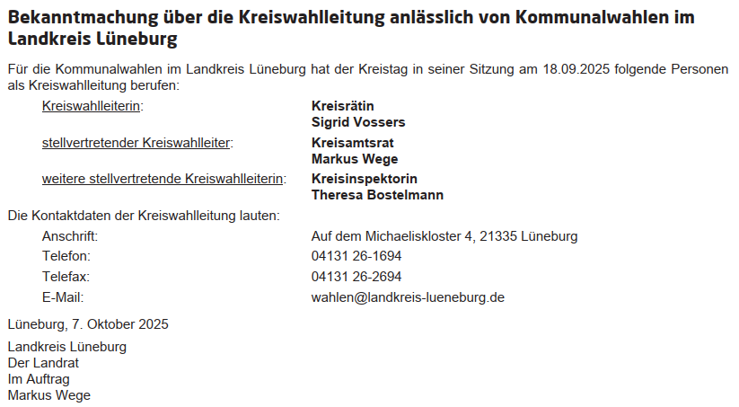 Für Fragen zur Wahl nutzen Sie gerne die E-Mail-Adresse wahlen@landkreis-lueneburg.de. Bei Anfragen aus der Presse wenden Sie sich bitte zunächst an die Pressestelle des Landkreises Lüneburg.