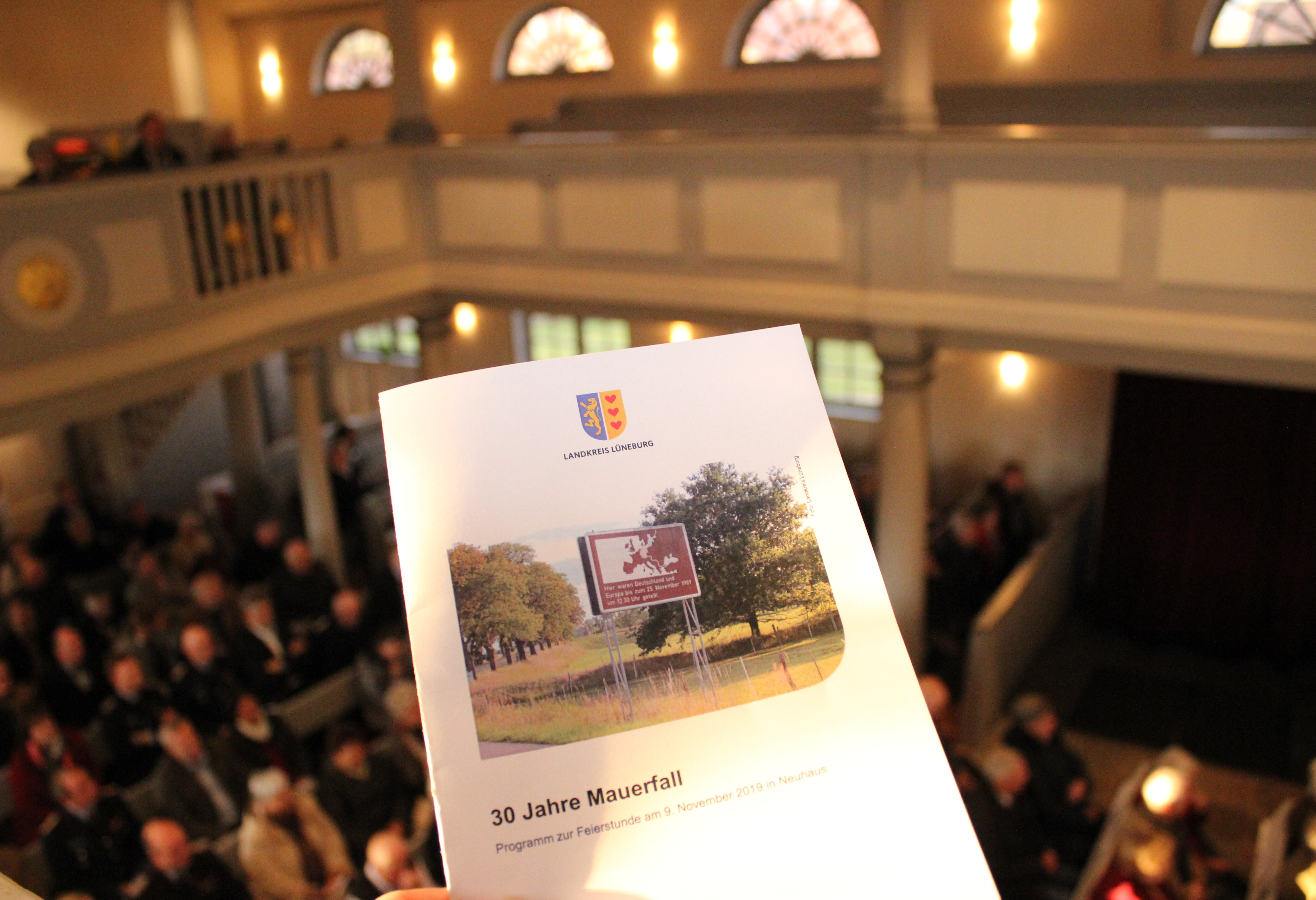 „Wahnsinn!“ – Mit einem Wort versuchten 1989 die Menschen an der Elbe das Unfassbare auszudrücken: Die Mauer war gefallen, der Stacheldraht fiel und Familien und Freunde konnten sich nach jahrzehntelanger Trennung wieder begegnen. Endlich konnten die Menschen aus Ost und West die Grenze passieren. Dies bleibt für die Menschen der Region ein unvergessliches Erlebnis. Der Landkreis Lüneburg erinnerte am 9. November 2019 mit einer Feierstunde in Neuhaus/Elbe an die Friedliche Revolution vor 30 Jahren. In der voll besetzten Marienkirche begrüßte Landrat Jens Böther etwa 300 Menschen, die Pastor Matthias Schieferdecker zunächst mit einer kurzen Andacht einstimmte.